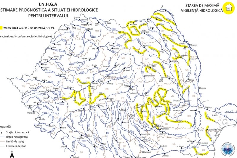 Potrivit estimărilor realizate de hidrologi, în intervalul 29 mai, ora 11:00 - 30 mai, ora 00:00, se vor înregistra viituri rapide, creşteri de debite şi de niveluri, cu posibile depăşiri ale Cotelor de atenţie, pe următoarele cursuri de apă: Mureş - afluenţii aferenţi sectorului aval confluenţă cu râul Târnava - amonte S.H. Brănişca (judeţele: Alba, Sibiu şi Hunedoara), Olt - afluenţii aferenţi sectorului aval confluenţă cu râul Şercaia - amonte confluenţă cu râul Lotru (judeţele: Braşov, Sibiu şi Vâlcea), Prahova - bazin superior şi afluenţi bazin mijlociu şi inferior (judeţele: Prahova şi Ialomiţa), Călmăţui (judeţele: Buzău şi Brăila), Buzău - bazin amonte S.H. Nehoiu şi afluenţii aferenţi sectorului aval S.H. Nehoiu (judeţele: Braşov, Covasna, Prahova, Buzău şi Brăila), Râmnicu Sărat - bazin superior şi afluenţi bazin mijlociu şi inferior (judeţele: Buzău şi Vrancea), Putna - bazin superior şi afluenţi bazin mijlociu şi inferior (judeţul Vrancea), Trotuş - bazin superior şi afluenţi bazin mijlociu şi inferior (judeţele: Harghita, Bacău, Neamţ, Covasna şi Vrancea), Bistriţa - bazin superior şi afluenţi bazin mijlociu şi inferior (judeţele: Suceava, Harghita, Neamţ şi Bacău), Moldova - bazin superior şi afluenţi bazin mijlociu şi inferior (judeţele: Suceava şi Neamţ), Suceava - bazin superior şi afluenţi bazin mijlociu şi inferior (judeţul Suceava), Bârlad - bazin amonte S.H. Negreşti şi afluenţii aferenţi sectorului aval S.H. Negreşti (judeţele: Neamţ, Iaşi, Vaslui, Bacău, Galaţi şi Vrancea), Jijia - bazin amonte S.H. Dângeni şi afluenţii aferenţi sectorului aval S.H. Dângeni (judeţele: Botoşani şi Iaşi) şi Prut - afluenţii aferenţi sectorului amonte confluenţă cu râul Jijia (judeţele: Botoşani şi Iaşi).