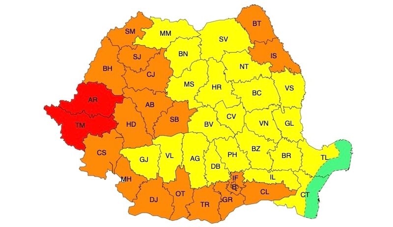 În județele Timiș și Arad valul de căldură va persista pentru a șaptea zi consecutiv. Temperaturile maxime vor fi în general de 38...39 de grade. Va fi caniculă și disconfort termic deosebit de accentuat, iar indicele temperatură-umezeală (ITU) va depăși pragul critic de 80 de unități. Minimele, de 19...25 de grade, local vor caracteriza o noapte tropicală.