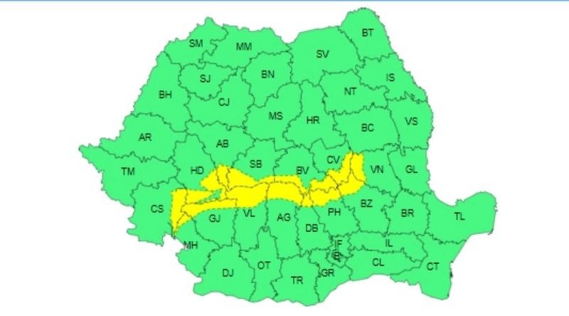 Judeţele care se vor afla parţial sub Cod galben de ninsori sunt: Caraş - Severin, Hunedoara, Alba, Sibiu, Braşov, Covasna, Vrancea, Buzău, Prahova, Dâmboviţa, Argeş, Vâlcea, Gorj şi Mehedinţi.