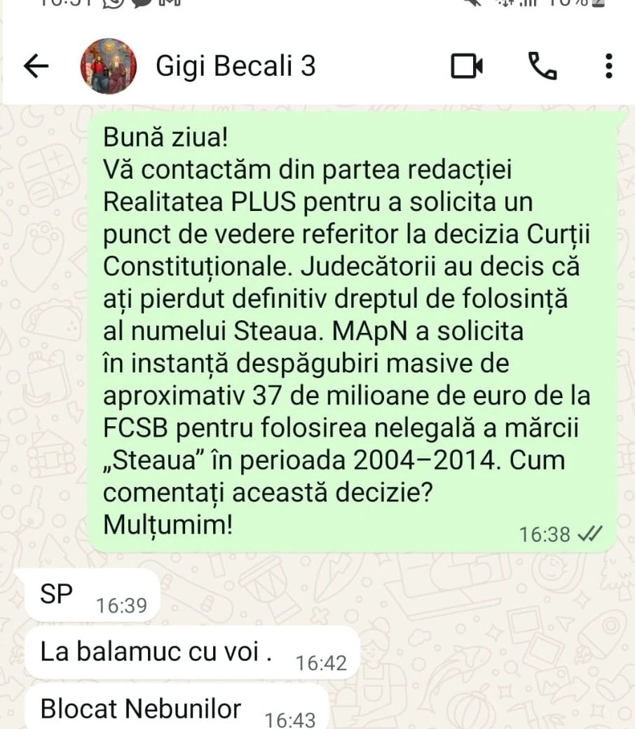 Solicitat să ofere un drept la replică, Becali a preferat, în stilul caracteristic, să lanseze injurii la adresa jurnaliștilor Realitatea Plus.