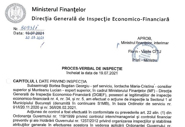 Procesul-verbal al controlului este realizat de Direcția Generală de Inspecție Economico-Financiară din Ministerul Finanțelor, minister condus de Florin Cîțu în calitate de ministru interimar al Finanțelor. Ministerul a sesizat Parchetul pentru deschiderea unui dosar penal.