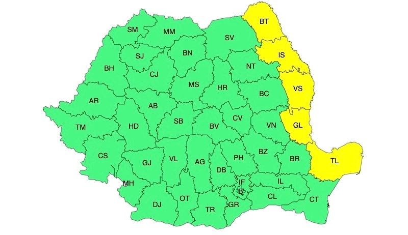 În intervalul menționat, în estul Moldovei și în nordul Dobrogei vântul va avea intensificări cu viteze în general de 55...65 km/h.