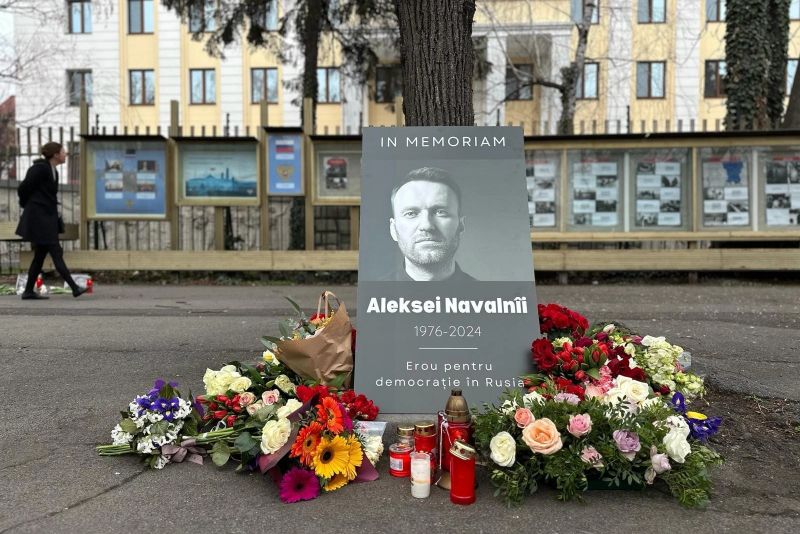 Buchete de flori albe și lumânări au fost aranjate pe trotuarul din fața clădirii care adăpostește sediul Ambasadei Federației Ruse din Șoseaua Kiseleff Nr.6, București. În apropiere de acestea se află și două fotografii ale lui Navalnîi.