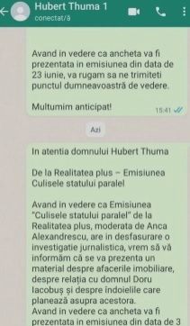Anca Alexandrescu a afirmat, miercuri seară, la Culisele statului paralel, că Hubert Thuma „are un director de cabinet, modest, dar a crescut frumos. L-a pus și în Compania aeroporturilor. Am spus ca increngaturile sunt mari. Acest mod, modest pana la un anumit moment, a reusit sa cumpere din agoniseala lui un teren, de un sfert de milion. Puțin, e maruntis. Băieți, suntem pe urmele voastre!”.