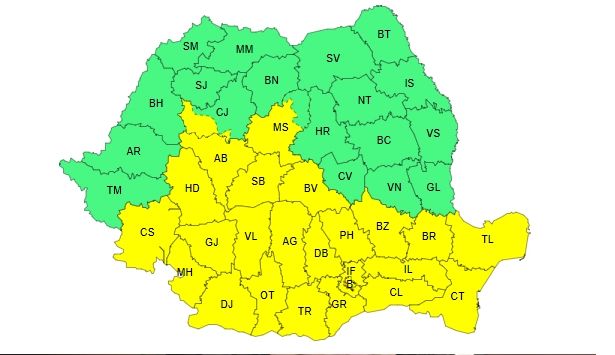 De asemenea, de sâmbătă, de la ora 10.00, până duminică la aceeaşi oră, este cod galben în mai bine de jumătate din ţară.