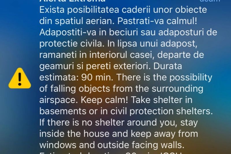 Mesajul transmis către populație, face un apel la calm, iar în cazul în care cad obiecte din spațiul aerian, să respecte recomandările de adăpostire și de autoprotecție transmise prin mesajul RO-Alert.
