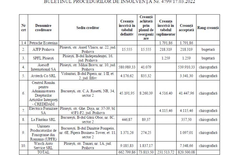 Pe rând, Ghiță datorează bani pentru companiile ASESOFT INTERNATIONAL SA în cuantum de peste 206.200.000 lei, TEAMNET INTERNATIONAL SA în cuantum de peste 442.400.000 lei, INFRATEL NET SRL, în cuantum de peste 17.900.000 lei, 2K TELECOM SRL în cuantum de 395.472.034 lei, TVMP SRL, în cuantum de peste 660.000 lei.