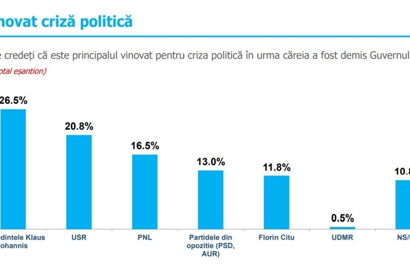 De la președintele care a câștigat alegerile din 2019 cu un scor zdrobitor, de 67%, Klaus Iohannis a ajuns să fie considerat vinovat de actuala criză politică. 26% dintre românii care au răspuns sondajului spun că Iohannis este principalul vinovat pentru criza în urma căreia a fost demis Guvernul Cîțu. Președintele este urmat de USR, cu 20 de procente și PNL - 16 procente.